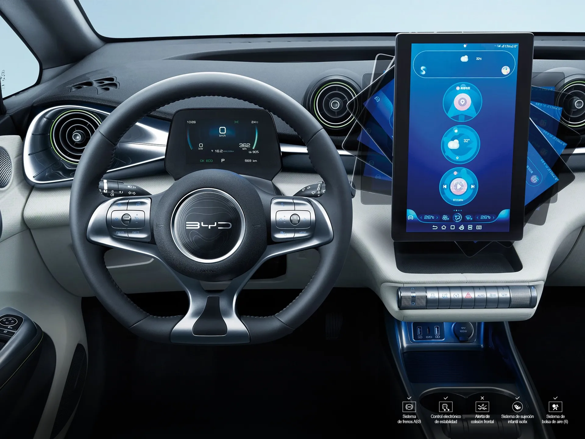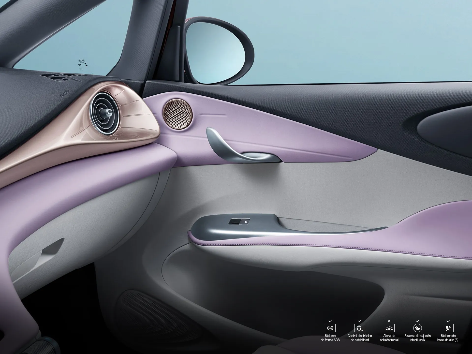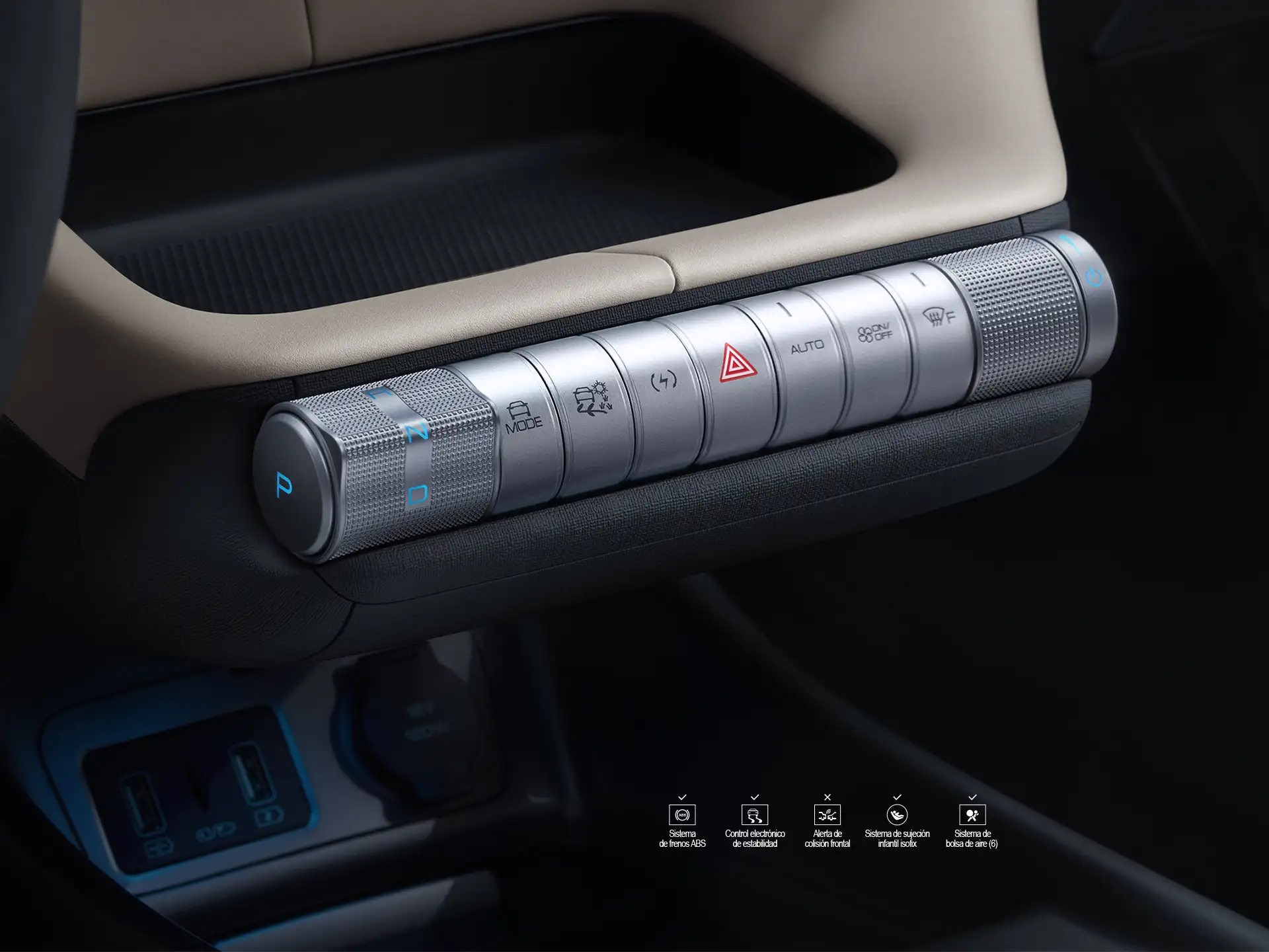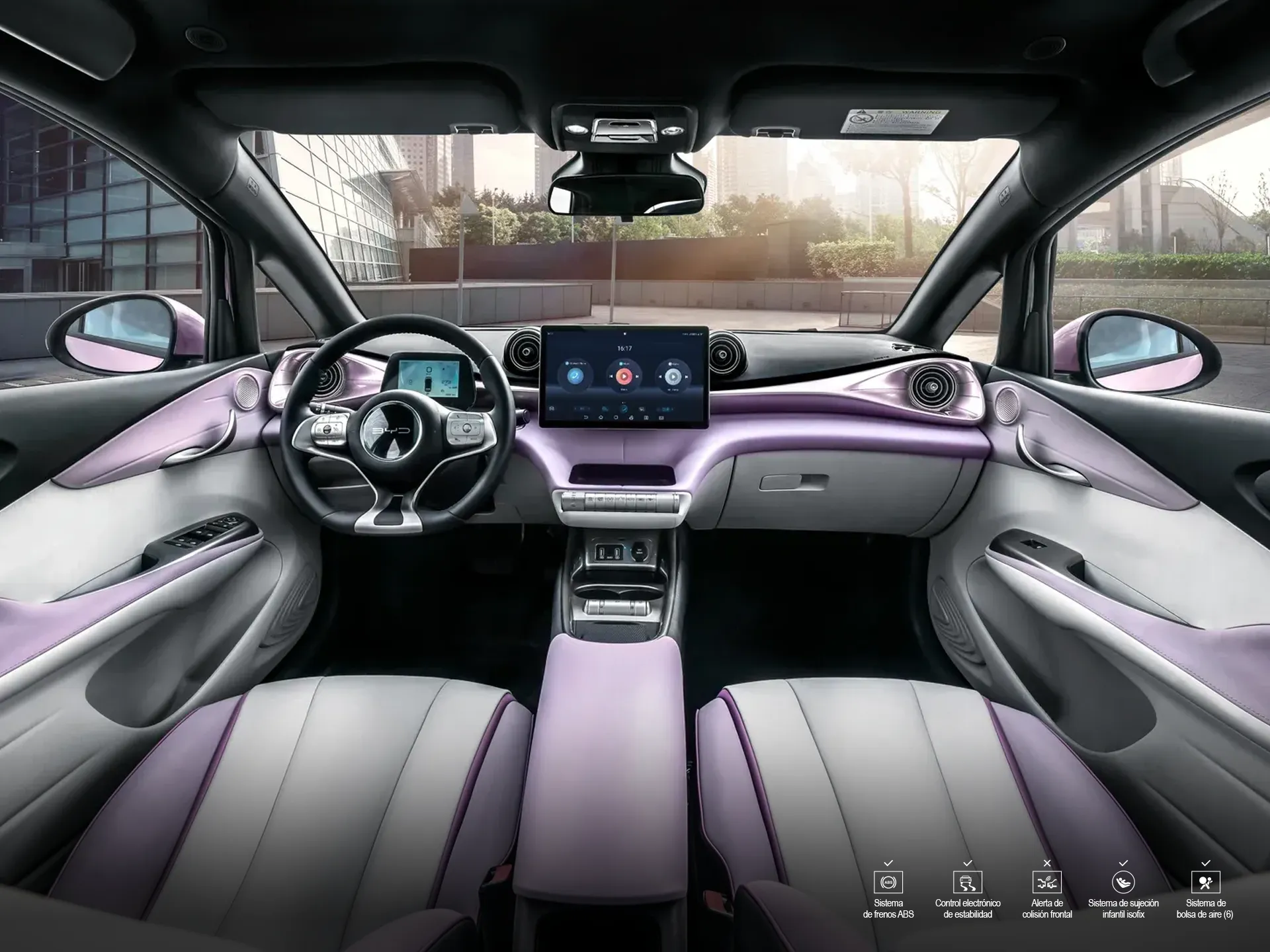 El futurista diseño de la consola central flotante configura un puesto de conducción moderno y dinámico que se complementa con una moldura en acabado metalizado que recorre todo el salpicadero, formando una superficie curvada especialmente atractiva y minimalista.