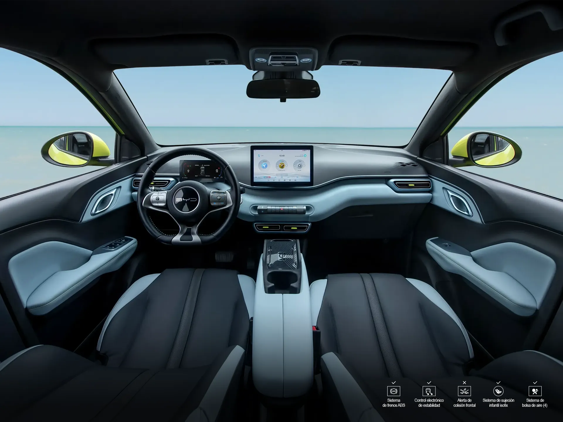 Ubicada en el centro del tablero, el sistema de cabina inteligente BYD conecta de manera integral a personas, automóviles y vida, con control de voz, KTV, GPS, entre otras funciones.