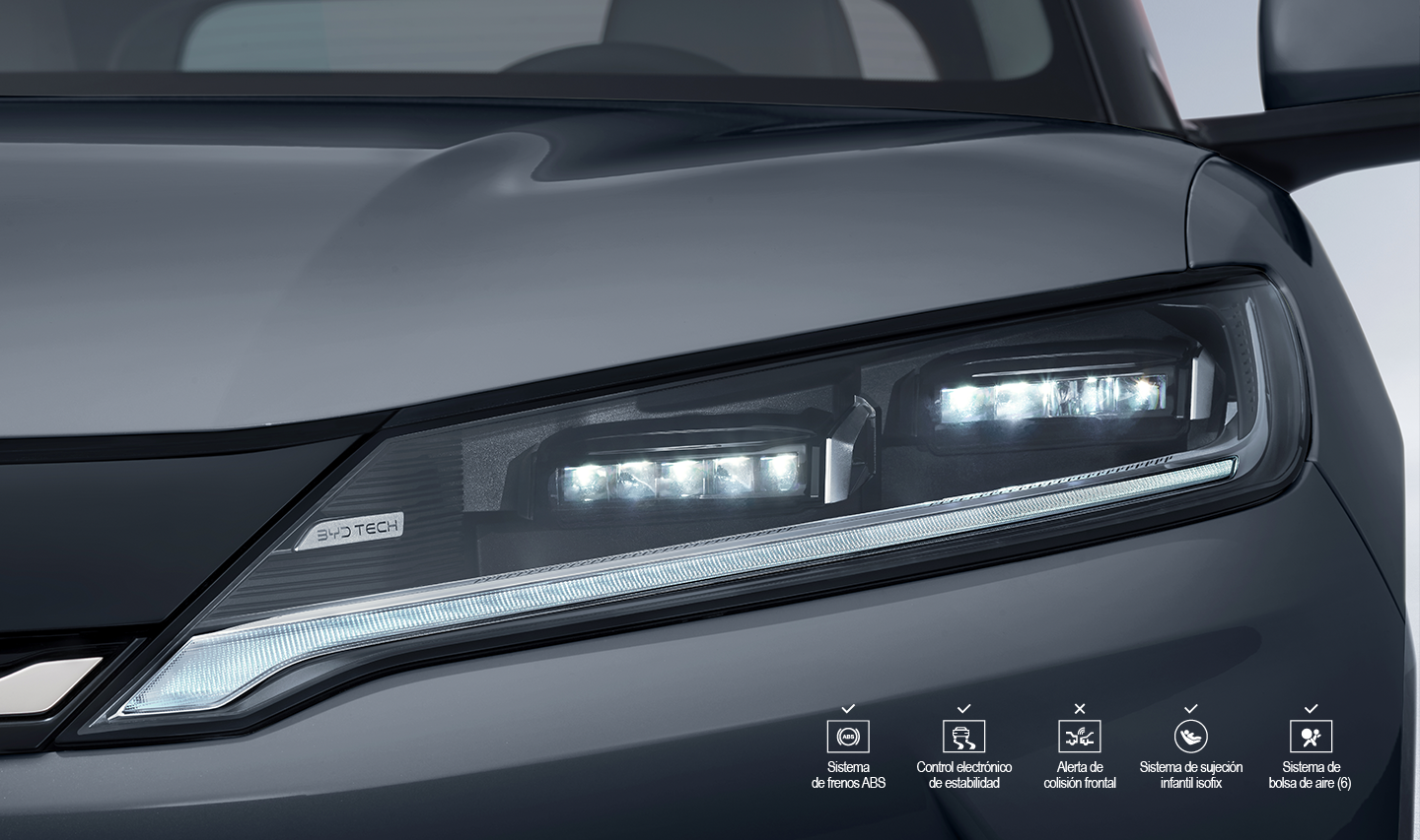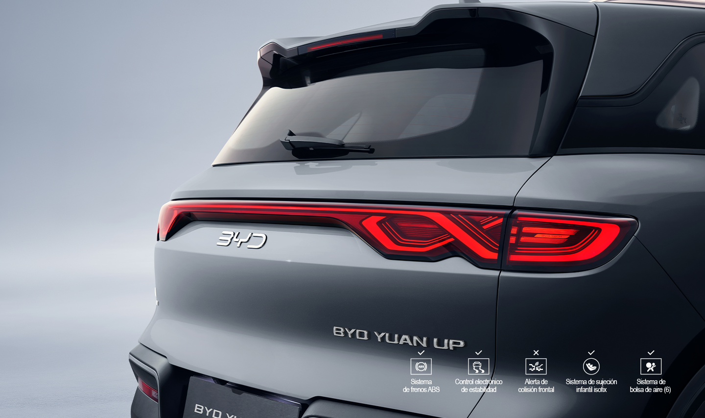 El Yuan UP está equipado con sistemas de seguridad que garantizan la protección de todos los ocupantes. Cuenta con 2 airbags delanteros, 2 laterales y 2 de cortina. Los cinturones de seguridad delanteros y traseros tienen pretensionadores y limitadores de fuerza, además de alarmas para garantizar su uso.