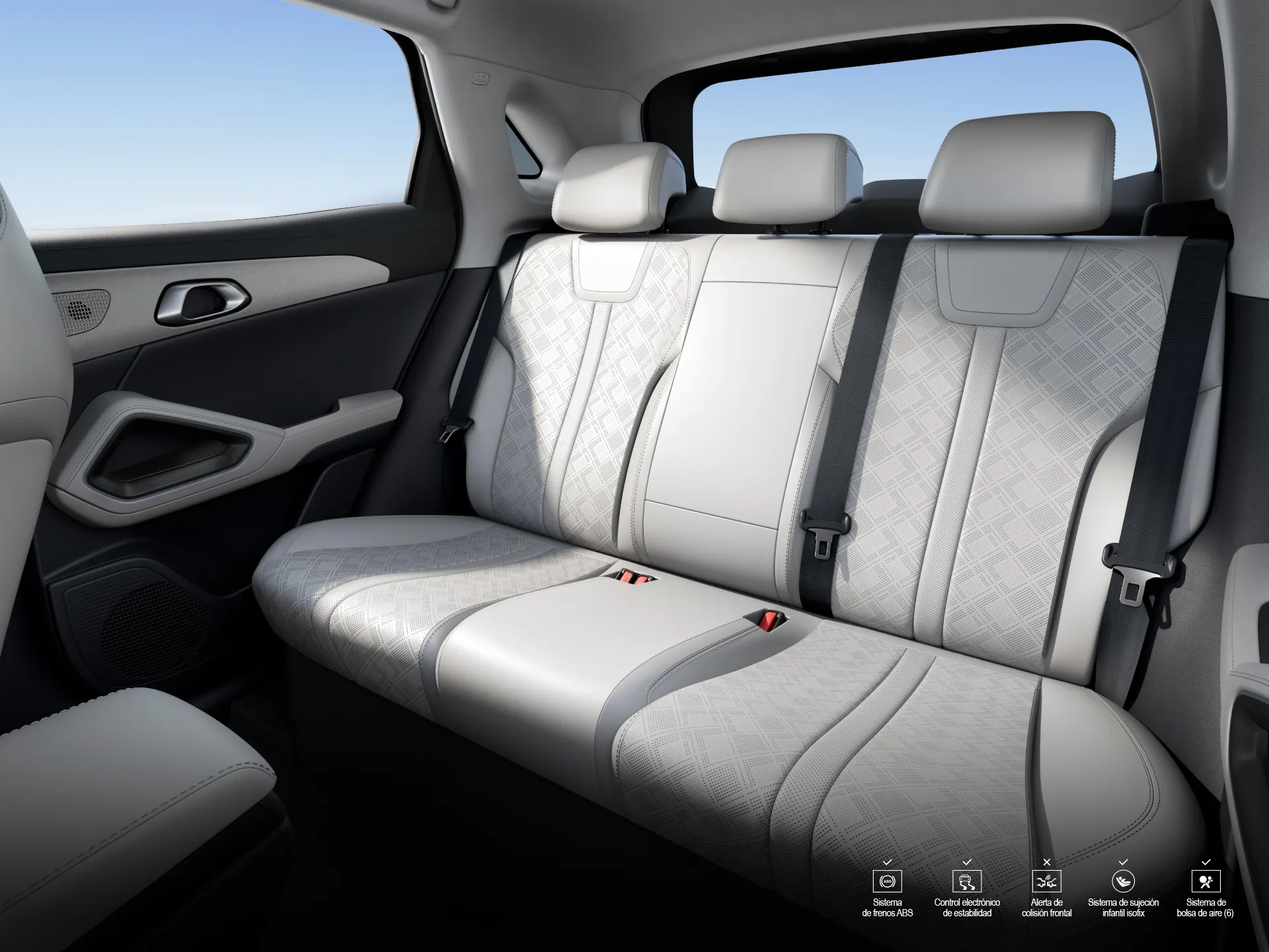 El interior del Yuan UP ofrece comodidad y estilo con tapicería premium. La segunda fila de asientos se puede dividir en una proporción de 60:40, y tanto la silla del conductor como la del pasajero tienen ajustes eléctricos (6 posiciones para el conductor y 4 para el pasajero) siendo inédito en este segmento. Los bolsillos en la parte posterior de las sillas delanteras y los anclajes ISOFIX en la segunda fila añaden funcionalidad adicional.